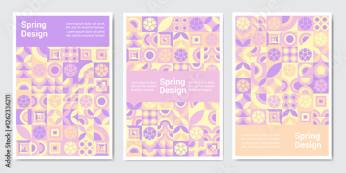 spring poster. Modern grid flyer with geometric shapes, geometry graphics and abstract background vector set. Geometry grid pattern banner vivid presentation illustration