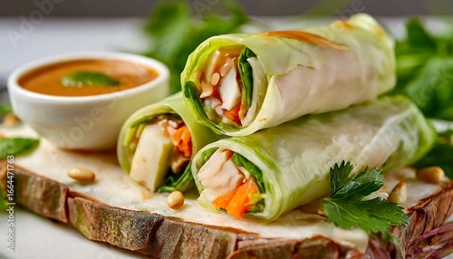 Spring rolls filled with chicken, spinach, carrots and rice noodles, served with peanut sauce