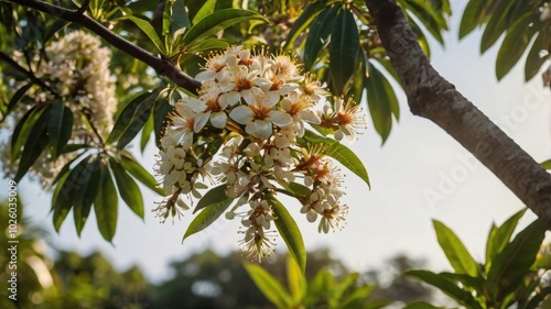 Springtime Blossom: Delicate white flowers cluster on a branch, bathed in warm sunlight. A serene image evoking feelings of peace and renewal.
