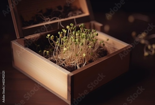 sprouting sprouts in a wooden box on a brown background, generative ai
