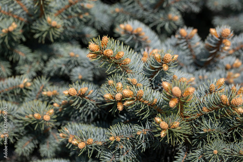 Spruce branch. Beautiful branch of spruce with needles. Christmas tree in nature. Green spruce. Spruce close up.