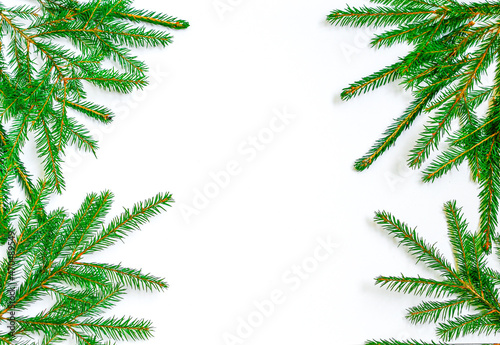Spruce twigs on a white background. Lots of green twigs in the corners. White background.