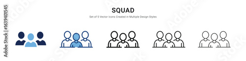 Squad Icon in Multiple Styles Vector Illustration, Including Two Colored and Black Variants Designed in Filled, Outline, Line, and Stroke Style for Web, Mobile, and UI Applications