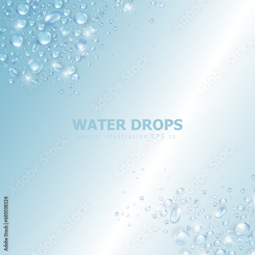Square banner with pure water drops or dew pattern as frame. Soft blue blank wallpaper with realistic 3d rain droplets or condensation on surface. Aqua fresh banner with collagen or water texture