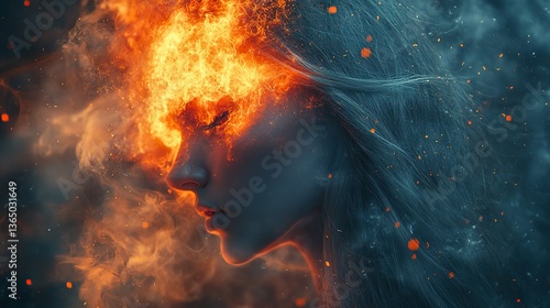 Square fragments woman's profile, exploding head, stress, burnout.