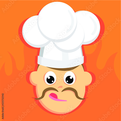 Square illustration of face of chef with moustache on orange background with fire. Flat vector.