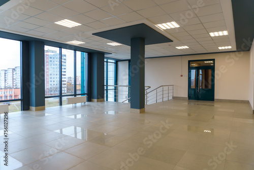 Square lamp on a white office ceiling. Interior design in the office. A fluorescent lamp on a modern suspended ceiling.