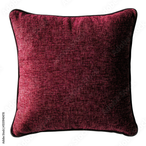 Square maroon cushion with a textured surface and dark trim on transparent background