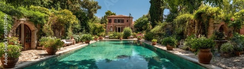 Square pool in the Greek villa garden concept. Beautiful villa with a serene pool surrounded by lush greenery.