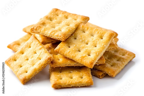 Square salted crackers, crispy, golden-brown, stacked on white.