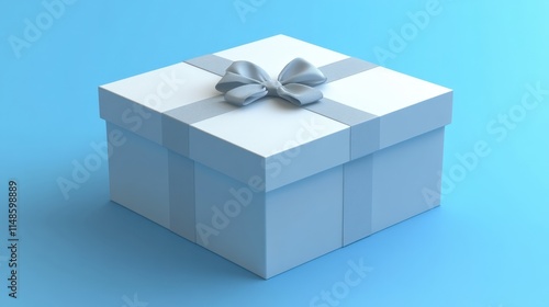 Square white gift box with light grey ribbon bow on light blue background.