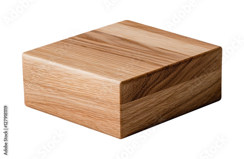 Square wooden block featuring natural wood grain patterns, smooth surfaces, and sharp edges, made of light brown wood with darker streaks. Isolated on transparent background, png.