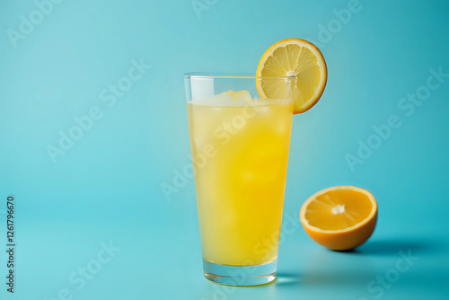Squeezed orange juice garnished with orange slice on blue background