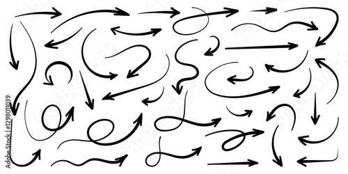 Squiggly black arrow set. Movement spiral lines, flat elements. Pencil brush arrows for icon, texture, sketch. Hand drawn childish doodle strokes. Isolated vector illustration on white background.