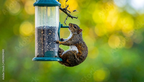 Squirrel hangs on a feeder filled with seeds, against a blurred green and yellow foliage background