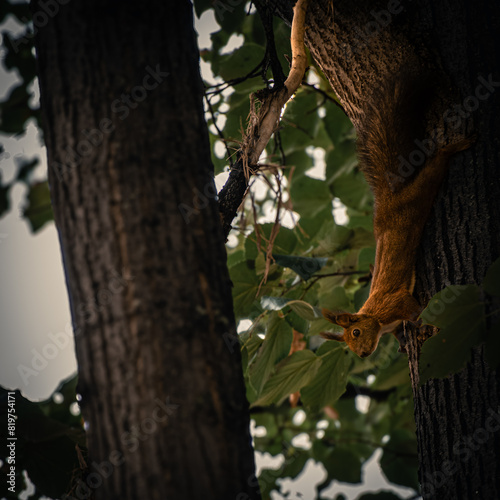 Squirrel perched on a tree trunk in Central Park, Skopje