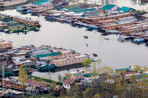 SRINAGAR, INDIA - April 15 2016: Lifestyle in Dal lake, man drive the boat in middle of the Dal lake and mountain background