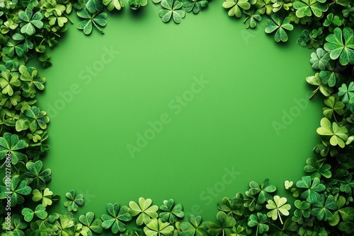 St. PatrickA's Day symbol frame with shamrocks on a bright green background.