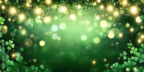 St. Patrick's Day banner background with shamrocks and bokeh lights, glitter light effects. green glowing design for a St. Patrick's Day party decoration or greeting card template.