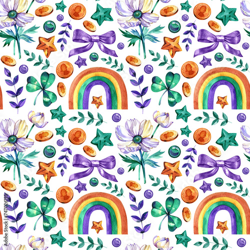 St. Patricks Day Seamless Pattern on a green background: clover, coins, rainbow. Hand drawn watercolor illustration. For paper, textile, packaging