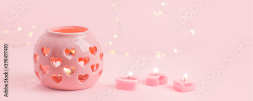 St. Valentine's day burning candles and pink cearmic candlstick on pink background, stylish monochrome holiday card with copy space, romance february day, mother, woman day