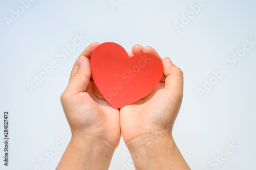 St. Valentine's Day. Heart cut out of paper in the hands of a child on a white background.