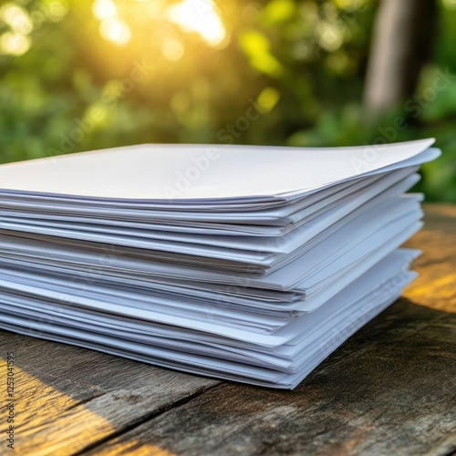 Stack of Blank Papers on a Wooden Table with Soft Sunlight and Green Nature Background in Outdoor Setting