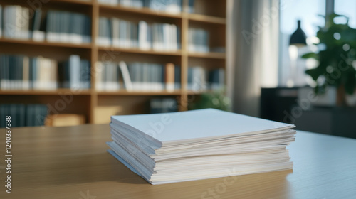 stack of blank papers rests on wooden table in well lit room, surrounded by bookshelves filled with books. serene atmosphere suggests space for study or work