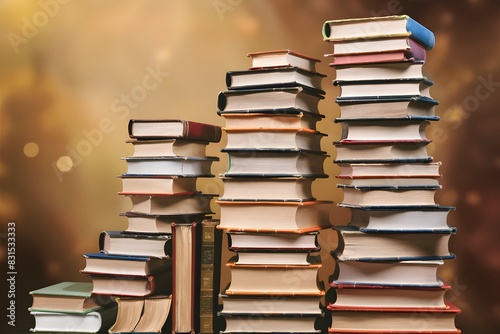 Stack of books symbolizes knowledge and nostalgia against warm, golden background