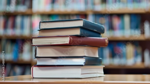 Stack of Books with Library Background, Symbolizing Knowledge and Learning
