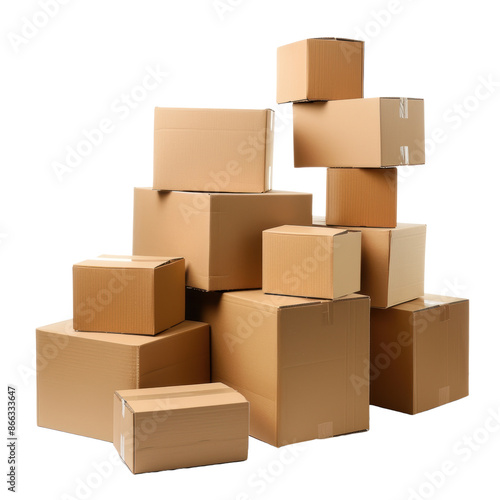 Stack of brown cardboard boxes isolated on a white background, ideal for moving, shipping, and storage purposes.