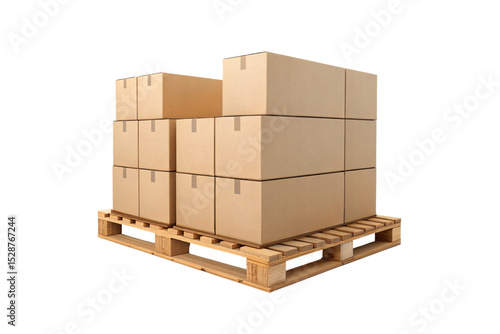 Stack of brown cardboard shipping boxes arranged in layers on wooden pallet for logistics, isolated on a transparent background