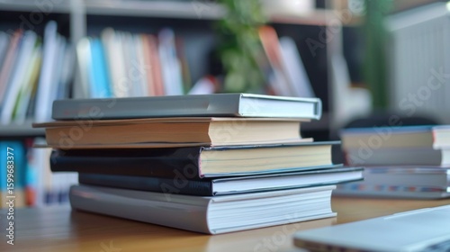 Stack of business and finance textbooks on a desk stock photo --ar 16:9 --raw --v 6 Job ID: 3fae9d7c-d3d7-4940-b2e5-98df44b5f30a