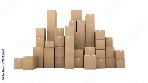 Stack of cardboard boxes arranged in a pile against a view on transparent background