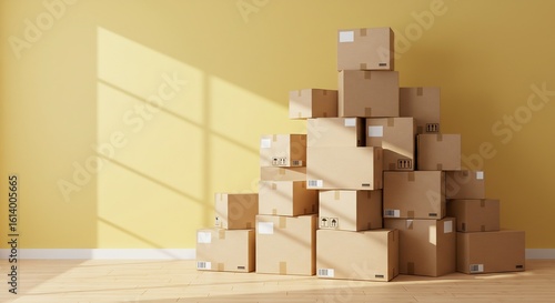 Stack of Cardboard Boxes in Empty Room with Sunlight Streaming Through Window - Moving, Relocation, Storage Concept