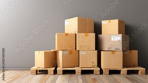 Stack of cardboard boxes on wooden pallets against a gray wall. Concept of delivery, shipping, moving, and storage.