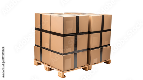Stack of cardboard boxes wrapped with straps on a pallet awaits transport.