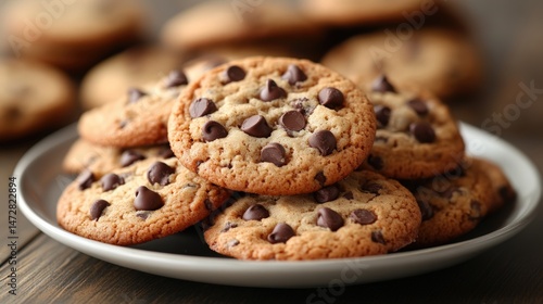 Stack of chocolate chip cookies on a plate.