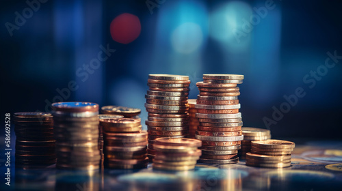 Stack of coins with blue light background, business and finance concept idea.generative ai