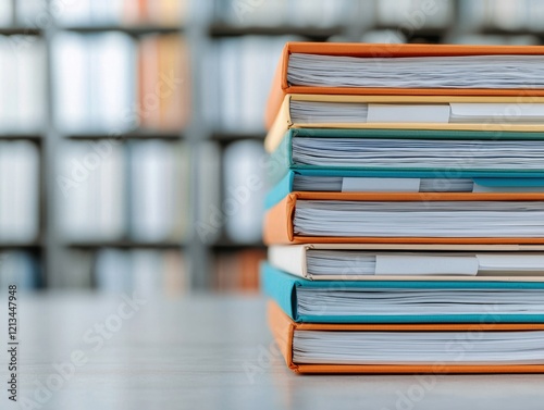 Stack of color-coded folders sitting on office desk promoting efficient organization