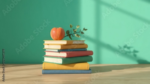 Stack of colorful books, light wood surface, and an orange peach with leaves against a light green wall