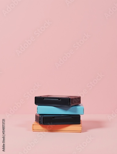 Stack of colorful boxes on a pastel pink background with minimalist composition