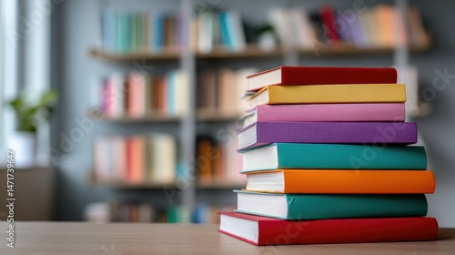 Stack of colorful educational books on a table in front of blurred shelves, suggesting focus and learning
