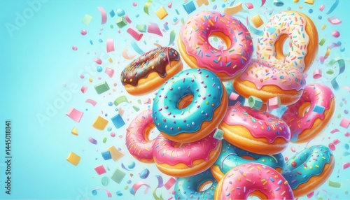 Stack of colorful glazed donuts with sprinkles and flying confetti on light blue background, bright festive dessert concept with copy space