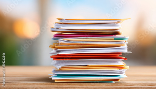 Stack of colorful paper documents on wooden table with blurred background, symbolizing document chaos and office clutter