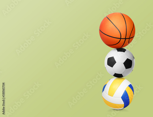 Stack of different sport balls on light yellow green background, space for text