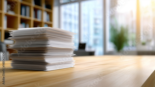 Stack of documents and folders on a desk in a bright, modern office with bookshelves in the background.