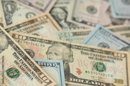 Stack of dollar bills. Hundred, fifty, twenty, ten, five dollars banknote close up
