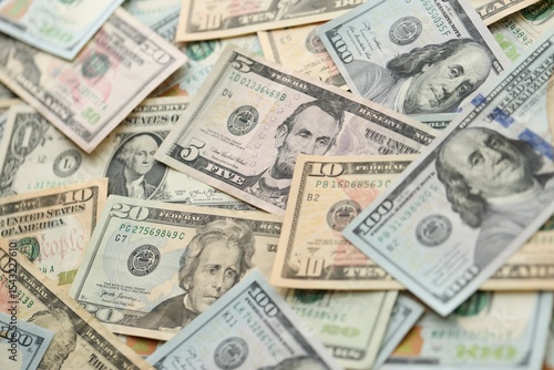 Stack of dollar bills. Hundred, fifty, twenty, ten, five dollars banknote close up