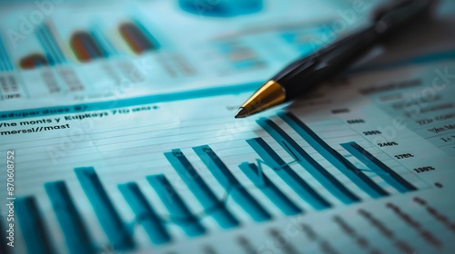 Stack of financial documents with figures and graphs, annual financial report And there is a pen on top.